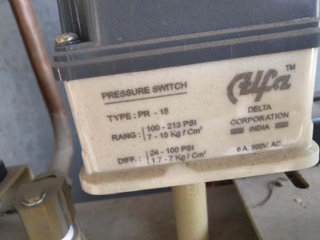 AIR COMPRESSOR PRESSURE SWITCH / TYPE : PR - 15 / PRESSURE RANGE : 100 - 213 PSI / MAKE : ALPHA / VOLT : 6A 500V AC / PRICE : RS. 925 /-